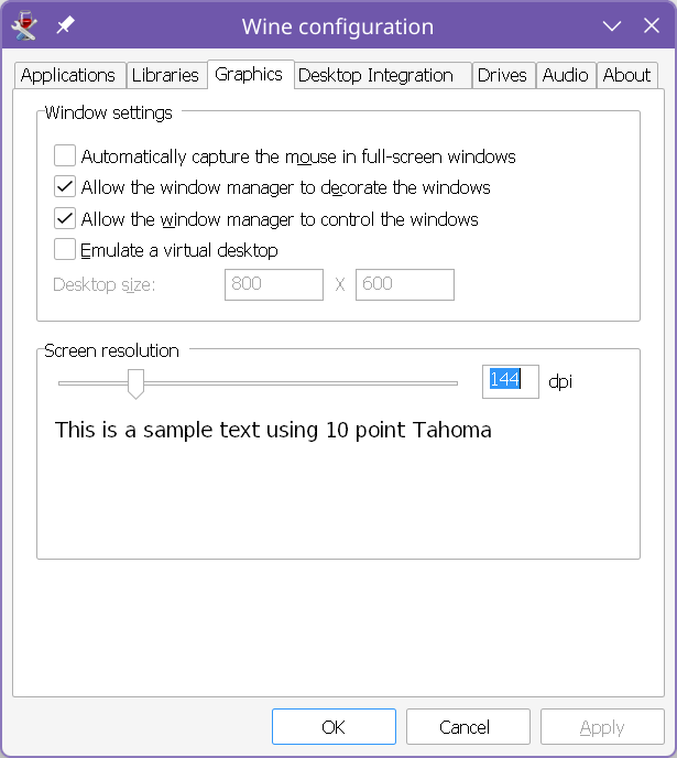 The X11 version of Wine8 is unaware of DPI scaling and always renders at a 1:1 pixel rate, unless forcibly scaled by the compositor.9 The Wayland version, however, is DPI-aware and scales windows appropriately. The default DPI setting is 96 DPI (meaning 100% scaling), which will result in blurred window content or even full-screen windows larger than the available screen space if the monitor scaling is set to values like 150% or 200%.